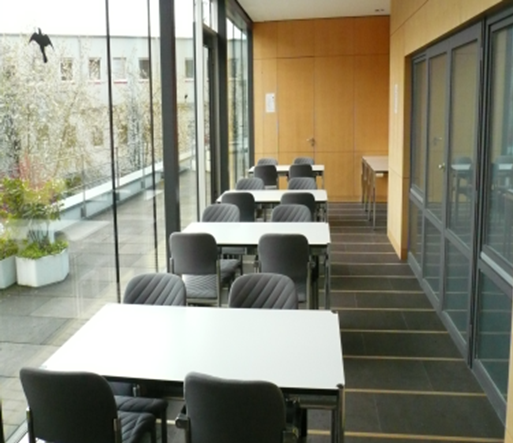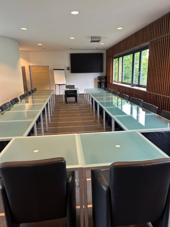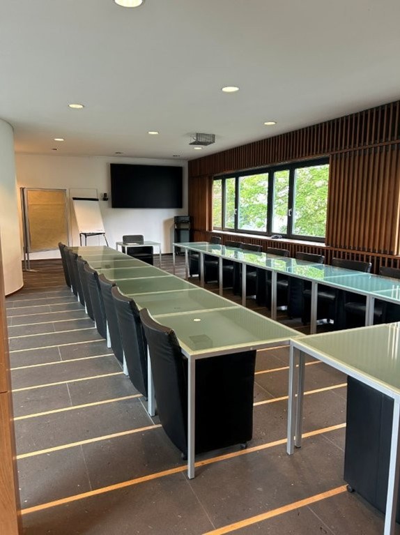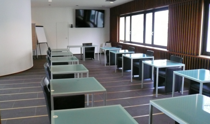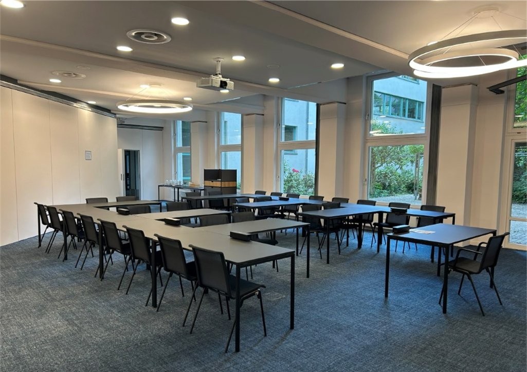 Mit einer Größe von 54 m² bietet der Raum für bis zu 24 Personen Platz. Auch er ist zentral im Erdgeschoss gelegen und aufgrund seiner Größe unterschiedlich einsetzbar.