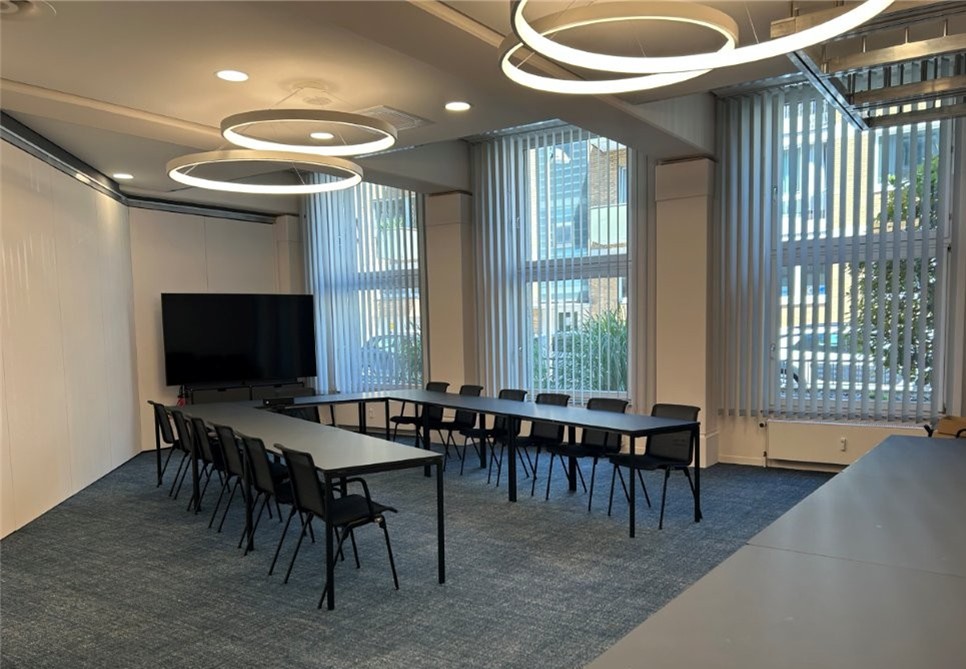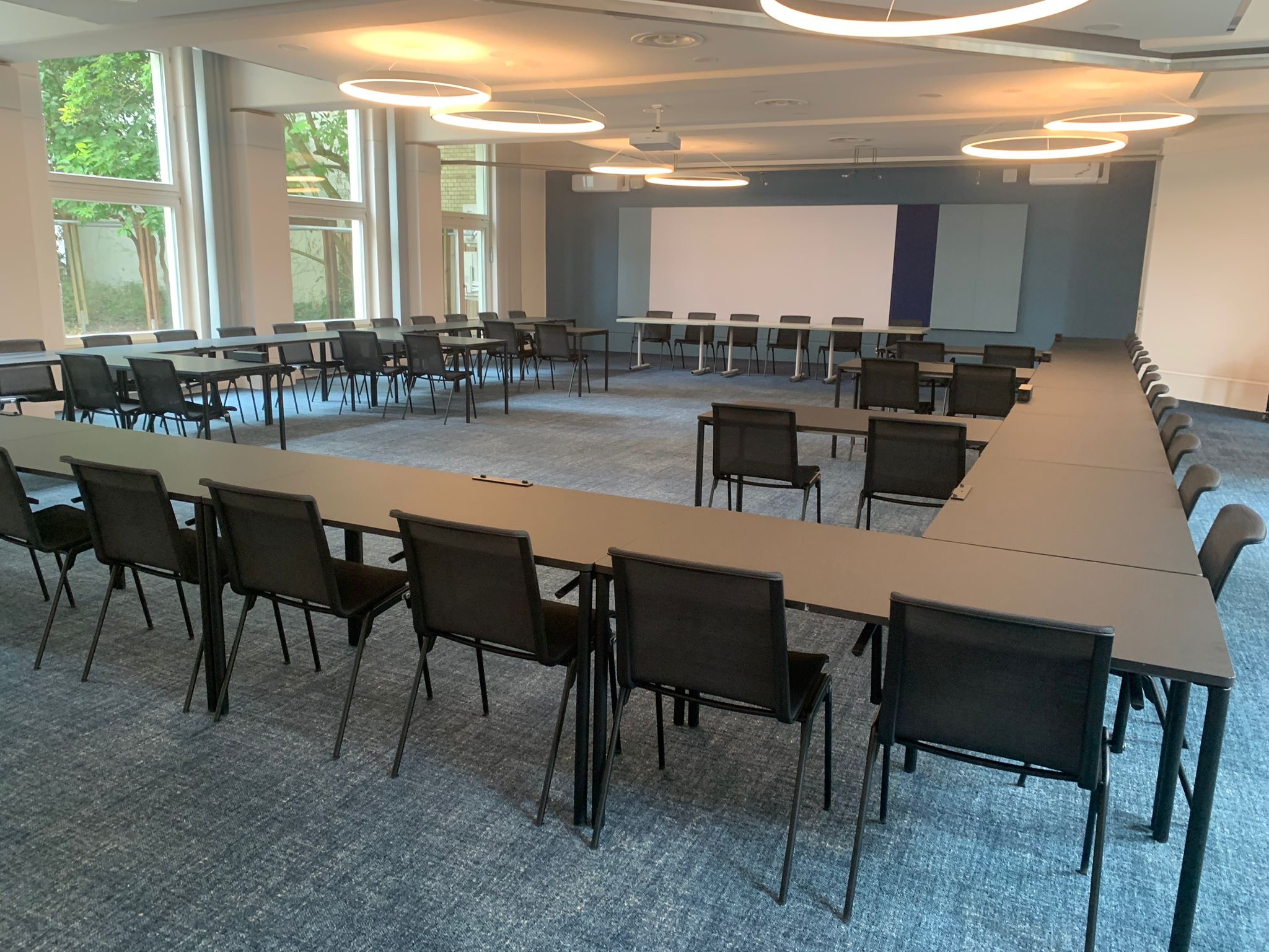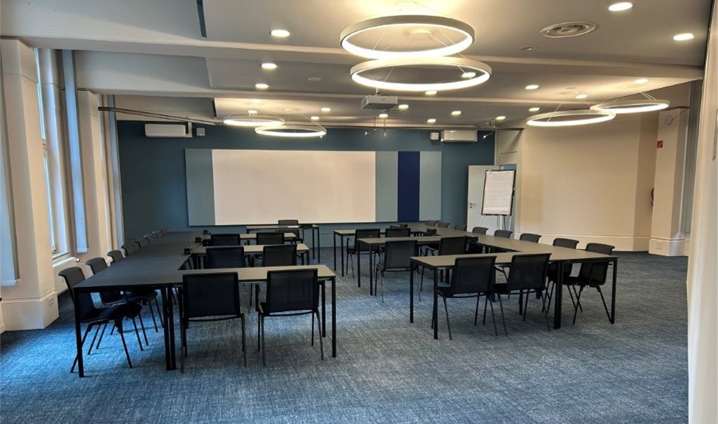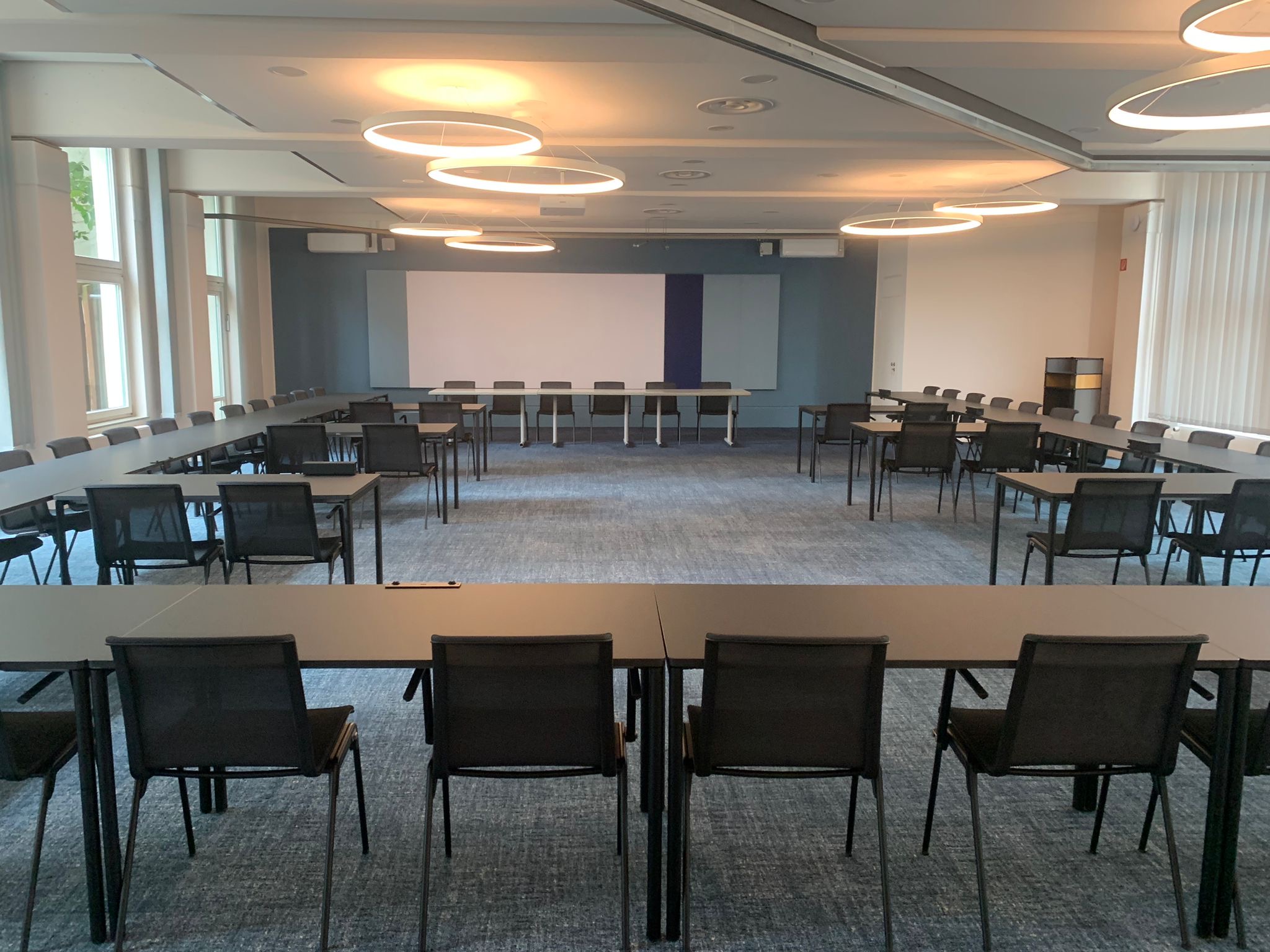 Mit einer Größe von 116 m² bietet der Raum für bis zu 80 Personen Platz. Er ist zentral in der Nähe des Empfangs und direkt neben Raum 2 im Erdgeschoss.