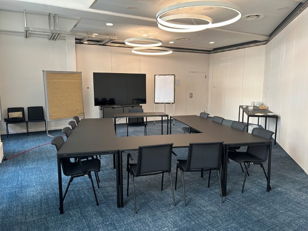 Mit einer Größe von 15 m² bietet der Raum im Hochparterre für bis zu 8 Personen Platz. Es ist der kleinste Besprechungsraum und kann daher gut als „Ausweichraum“ für kleinere Arbeitsgruppen genutzt werden.